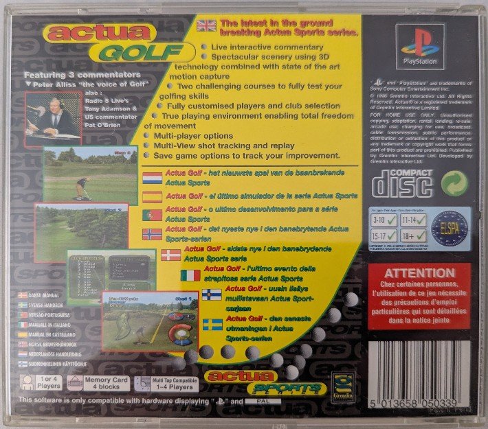 Actua Golf is a golf simulation developed and published by Gremlin Interactive, released in 1996 as part of the company’s Actua Sports series. The game features full 3D terrain and character models, two courses to play (country and tropical), customisable characters, and multi-view shot tracking with action replays, using a swing metre system familiar to fans of earlier golf titles.