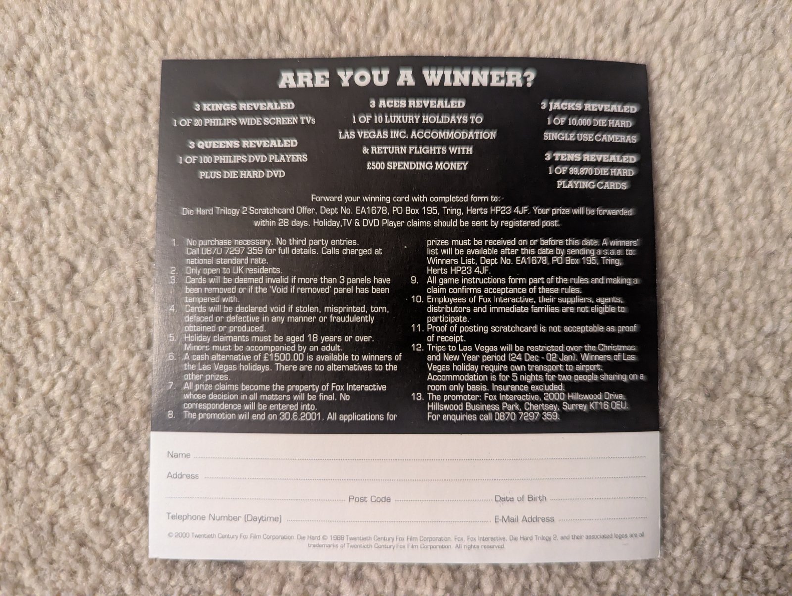 A promotional scratch card included with Die Hard Trilogy 2: Viva Las Vegas.