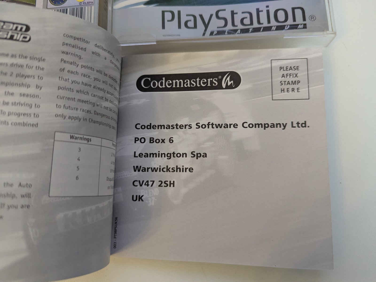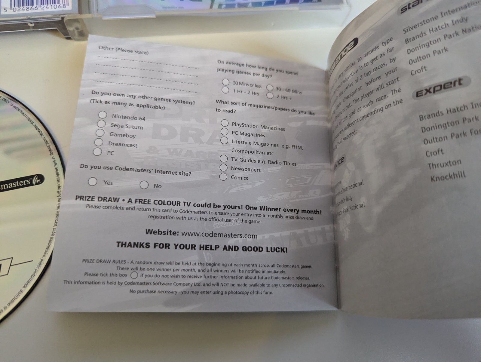 A registration card bound into the manual for TOCA Race Driver 2 Platinum edition.