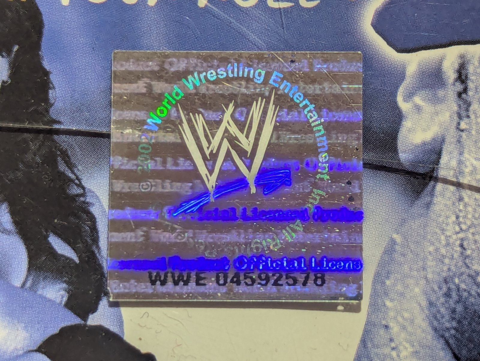 A holographic rectangular sticker confirming official WWF licensing for a 2002 wrestling release.
