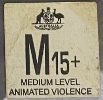 A white square classification sticker displaying the Australian M15+ age rating, suitable for ages 15 and over.