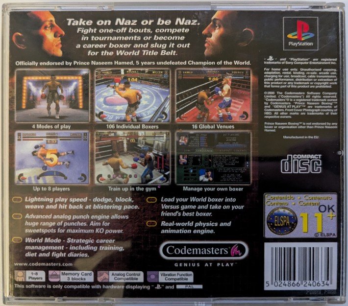 Prince Naseem Boxing is a boxing title developed and published by Codemasters, released for the PlayStation and featuring the UK’s then-prominent world champion Prince Naseem Hamed. This UK-only original release, dated 11 March 2000, is presented in a standard Full Jewel PAL case with a Hologram A on the case. The disc count is one, and the game supports five languages: English, French, German, Italian, and Spanish.