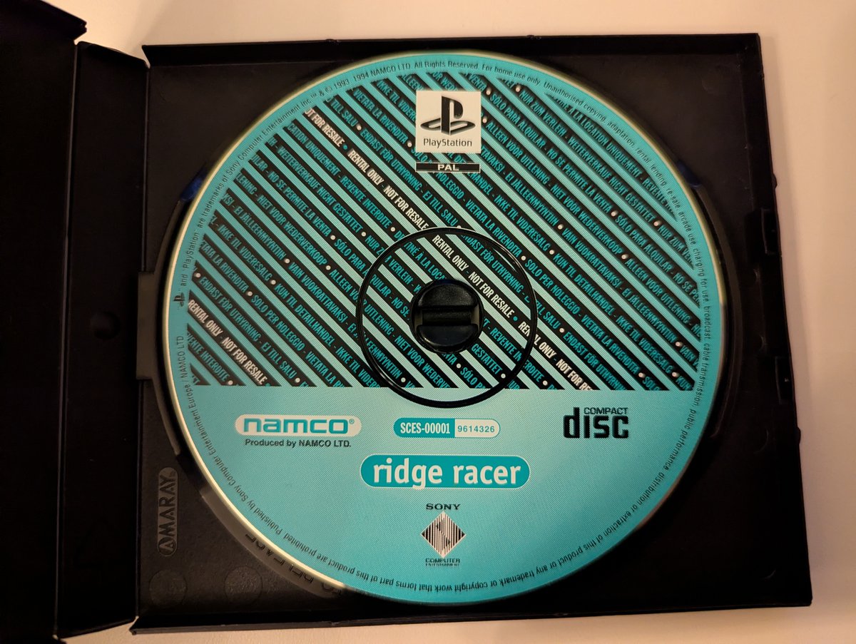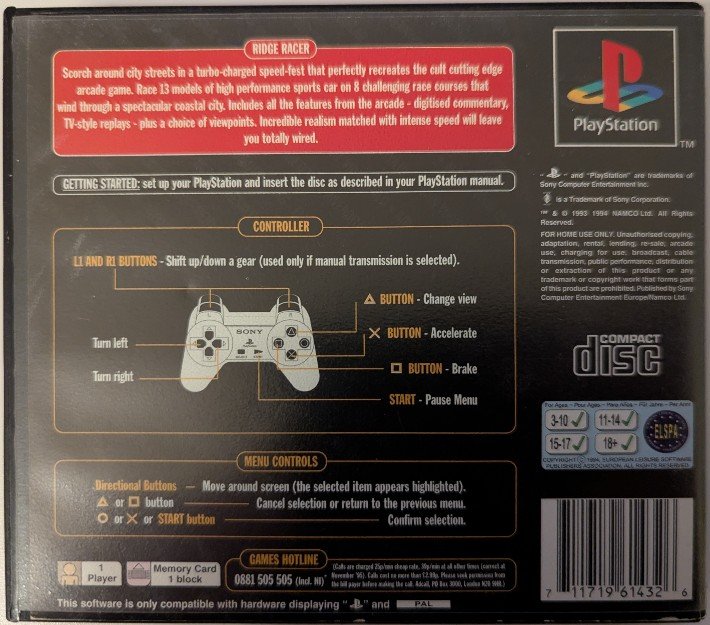 Ridge Racer is an arcade racing game developed by Namco and published in PAL territories by Sony Computer Entertainment Europe. One of the PlayStation’s most prominent launch titles, it demonstrated the console’s polygon rendering capabilities at a time when 3D racing games were still genuinely novel. This is the rental release, distributed across Italy, Germany, France, the UK, Netherlands, and Spain, with a release date of 29th September 1995, concurrent with the standard retail launch. Rental copies were produced specifically for video hire shops and are distinguished by their dedicated Rental Case rather than a standard jewel case. The case carries no hologram. No loose paperwork, case stickers, or bundled demo discs are included. The EAN barcode is 0711719657422. The game is English-language only. Rental copies in good, complete condition are relatively uncommon and are of particular interest to completionist collectors.