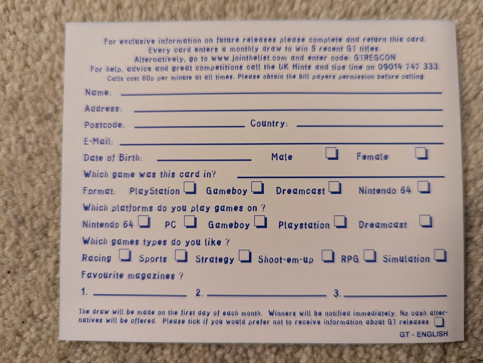 Home / Paperwork / GT Interactive Software Free Prize Draw Registration Card GT Interactive Software Free Prize Draw Registration Card Found In This item hasn't been documented in any releases yet.