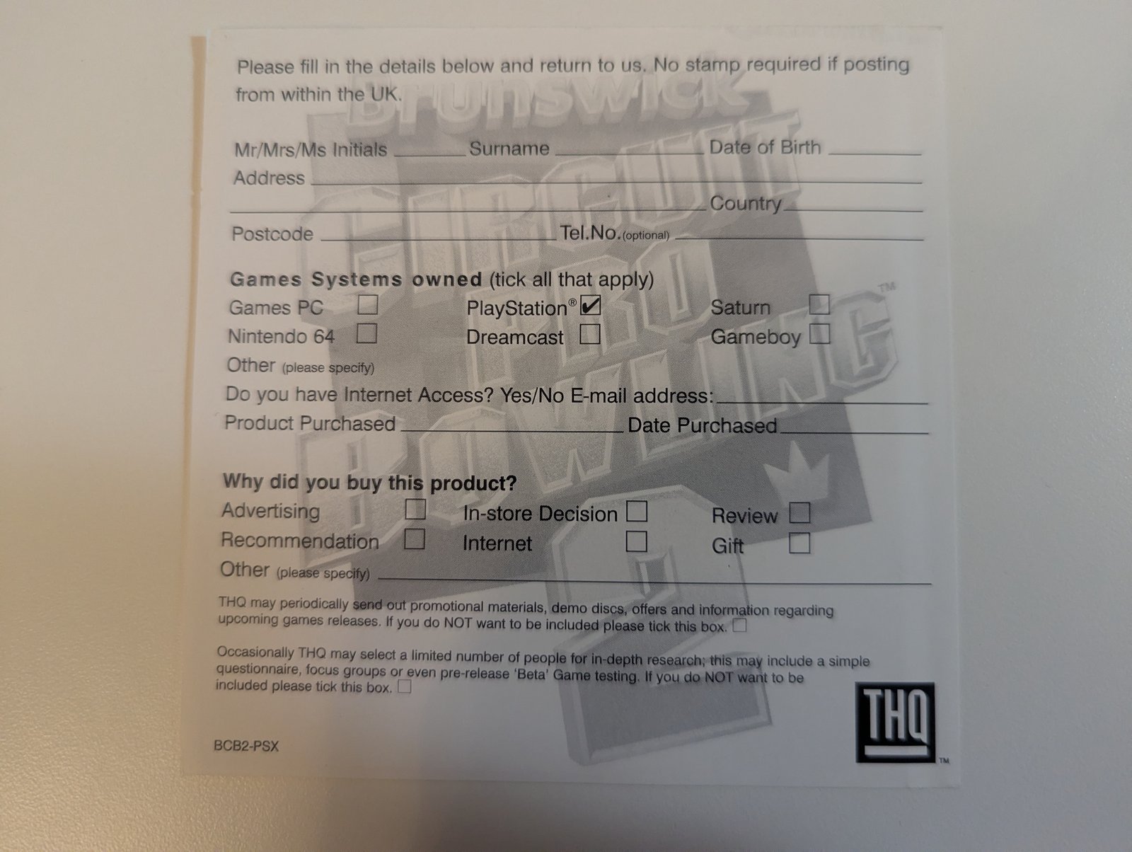 Home / Paperwork / THQ SCE7222 BCB2-PSX Registration Card THQ SCE7222 BCB2-PSX Registration Card Found In This item hasn't been documented in any releases yet.