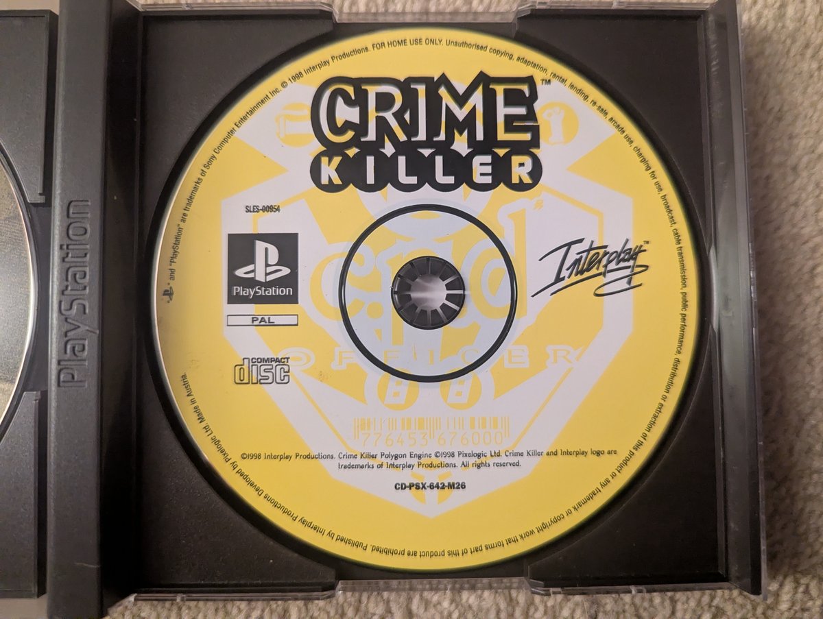 Home / Games / C / Crime Killer / Crime Killer Crime Killer SCES/SLES: SLES-00954 Disk Code: SLES-00954 EAN: 5026102000606 Type: Original Date: 6 January 1998 Publisher: Interplay Developer: Pixelogic Case: Full Jewel PAL Hologram: Hologram A Languages: English, French, German, Italian, Spanish Countries: UK Disc Images Manual Images 🏷️ Case Stickers Rectangle, Blue White, Crime Killer EN