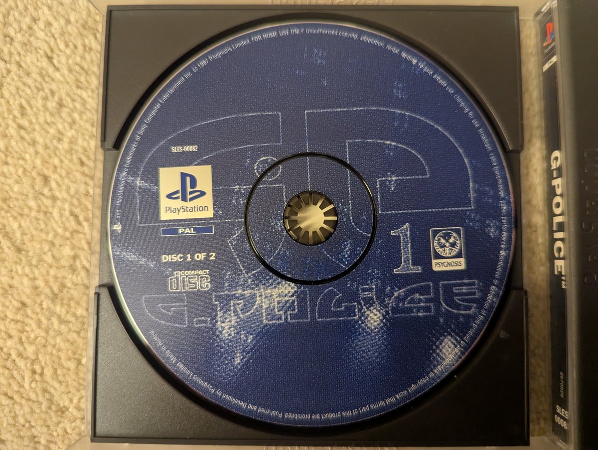 Home / Games / G / G-Police / G-Police G-Police SCES/SLES: SLES-00082 Disk Codes: Disc 1: SLES-00082 Disc 2: SLES-10082 EAN: 0711719670629 Type: Original Date: 15 October 1997 Publisher: Psygnosis Developer: Wheelhaus Case: Full Jewel PAL Hologram: Hologram Languages: English Countries: UK Disc Images 📄 Loose Paperwork Manual Registration Card - G-Police