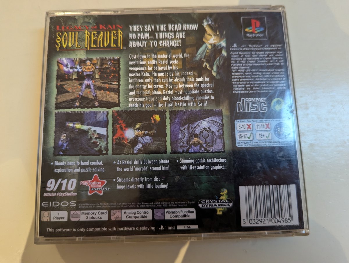 Home / Games / L / Legacy of Kain: Soul Reaver / Legacy of Kain: Soul Reaver Legacy of Kain: Soul Reaver SCES/SLES: SLES-01301 Disk Code: SLES-01301 EAN: 5032921004985 Type: Original Date: 24 June 1999 Publisher: Developer: Case: Full Jewel PAL Hologram: Hologram B Languages: English Countries: UK 📄 Loose Paperwork Eidos Interactive Blue Action Adventure Strategy Sport Role Playing Catalogue Eidos Interactive Knutsford Registration Card Soul Reaver PlayStation Tips Flyer