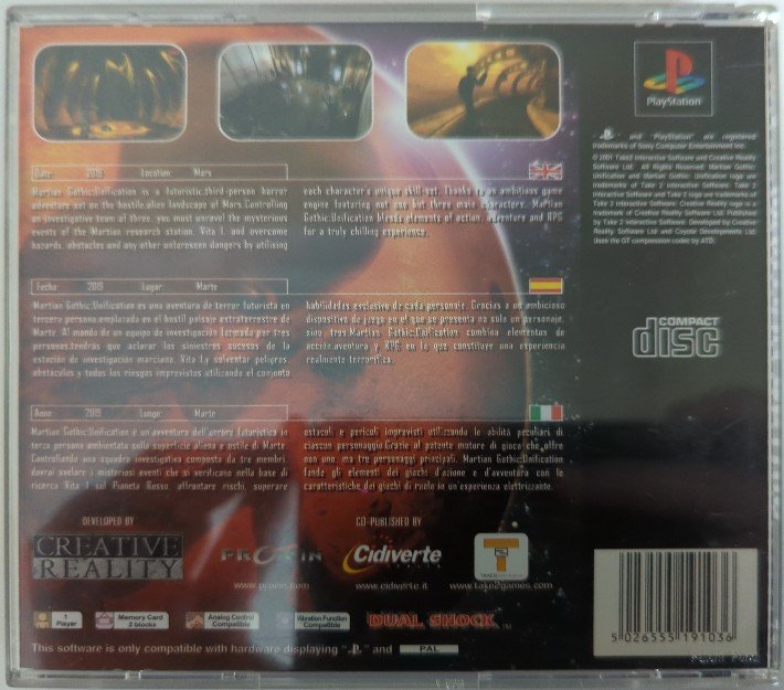 Martian Gothic: Unification is a 2000 survival horror game developed by Creative Reality for PlayStation and published by Take-Two Interactive. Set on a Martian base in 2019, three investigators arrive to find the crew reanimated as bloodthirsty zombies. The PlayStation version was one of a number of budget titles released near the end of the system’s lifespan. Three PAL variants are catalogued covering France, Germany, Italy, Spain, and the UK, all as Original pressings in Full Jewel PAL cases on a single disc with Hologram B on the case. Multi-language support across English, French, Italian, and Spanish applies to two of the three variants, with the German pressing carrying its own serial. A niche survival horror title from the twilight of the PlayStation era, of particular interest to collectors seeking out late-period PAL releases.