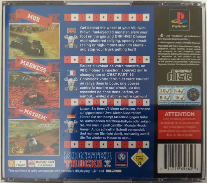 Monster Trucks is a racing game developed by Reflections Interactive and published by Psygnosis, arriving in the PAL region on 15 October 1997. Detailed source material for this specific title is limited, but it is catalogued as a Psygnosis release from the developers of the Destruction Derby series, with promotional stickers on some copies explicitly referencing that lineage.