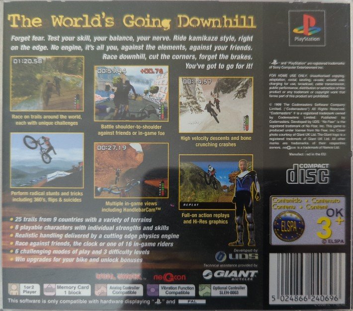 No Fear Downhill Mountain Biking is an extreme sports racing game developed by Unique Development Studios and published by Codemasters, released in 1999 for the PlayStation. The game features eight riders and a variety of treacherous downhill tracks inspired by real-world locations. PAL collectors will find an extensive release history, with eleven catalogued variants spanning the UK, France, Germany, Italy, and Spain. Release types include the original pressing alongside No 1 Bestseller Codemasters and Value Series No 1 Bestseller budget re-releases, the latter two appearing in the UK, France, and Germany. All variants are housed in Full Jewel PAL cases with a single disc and carry a Hologram B on the case. Language support across the range includes English, French, German, Italian, Spanish, and Swedish. The original release date is 16 November 1999. The breadth of release types makes this an interesting game for collectors tracking Codemasters’ value line publications.