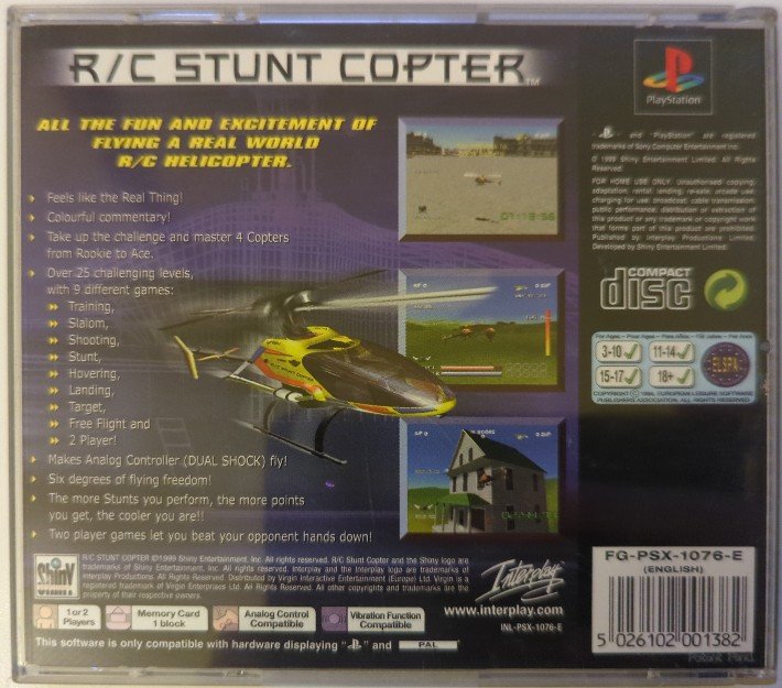 R-C Stunt Copter is a remote-control helicopter game developed by Big Grub with Shiny Entertainment and published by Interplay for the PlayStation. Eight PAL variants have been catalogued, a notably broad set of releases covering the UK, Italy, Spain, the Netherlands, Germany, and France. Release types include Original, White Label, and Value Series White Label across both the UK and the French and German markets. All releases are presented in Full Jewel PAL cases with Hologram B on the case, single disc. A Virgin Interactive 3266 Folded Registration Card is documented for the UK Original pressing. The game first appeared in PAL territories in October 1999.