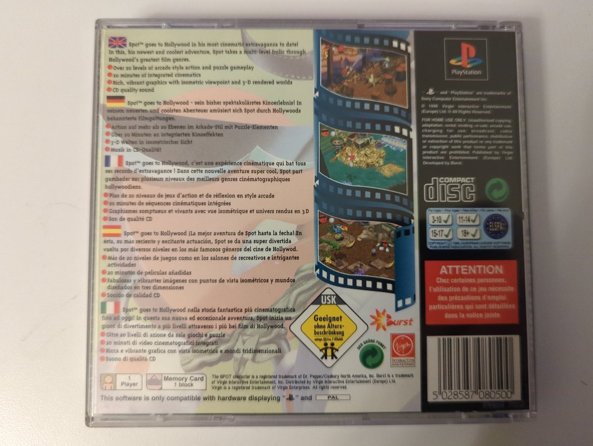 One variant is currently catalogued in the database, covering the UK, France, Germany, Italy, and Spain. The release comes in a Full Jewel PAL case with no hologram on the case, contains a single disc, and is an English-only release. No loose paperwork or bundled demo discs have been documented. As the sole catalogued PAL variant of a recognisable licensed platform title with FMV content on the PlayStation version, Spot Goes to Hollywood is a straightforward single-edition find for PAL collectors.