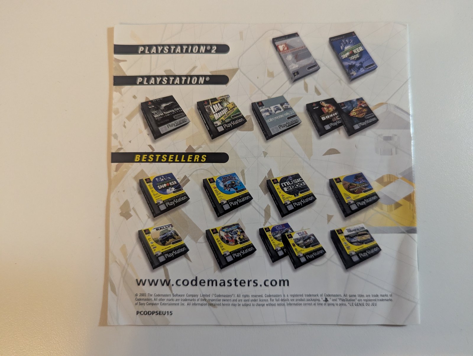 Home / Paperwork / Codemasters Catalogue Genius at Play Codemasters Catalogue Genius at Play Found In This item appears in 1 variant: Game Serial EAN TOCA 2 Touring Cars SLES-01542 5024866242065 View →