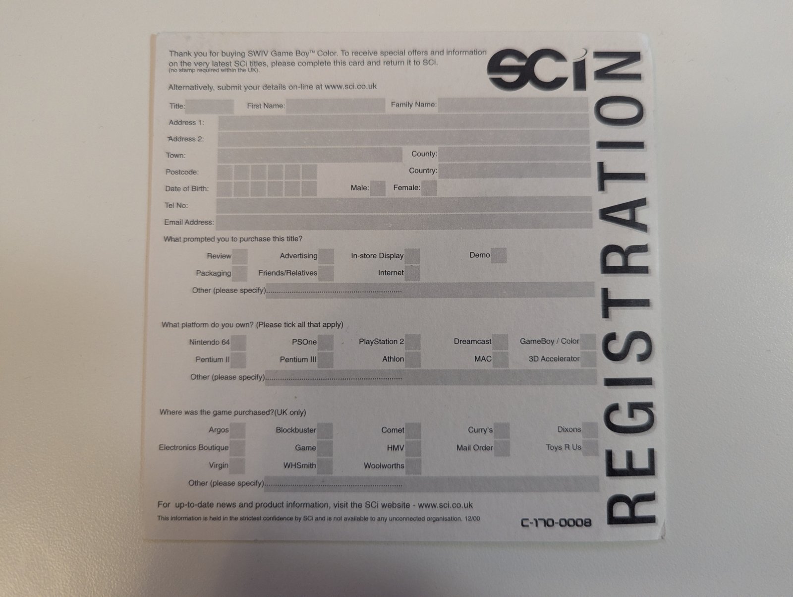 Home / Paperwork / SCi LON596 Registration Card SCi LON596 Registration Card Found In This item hasn't been documented in any releases yet.