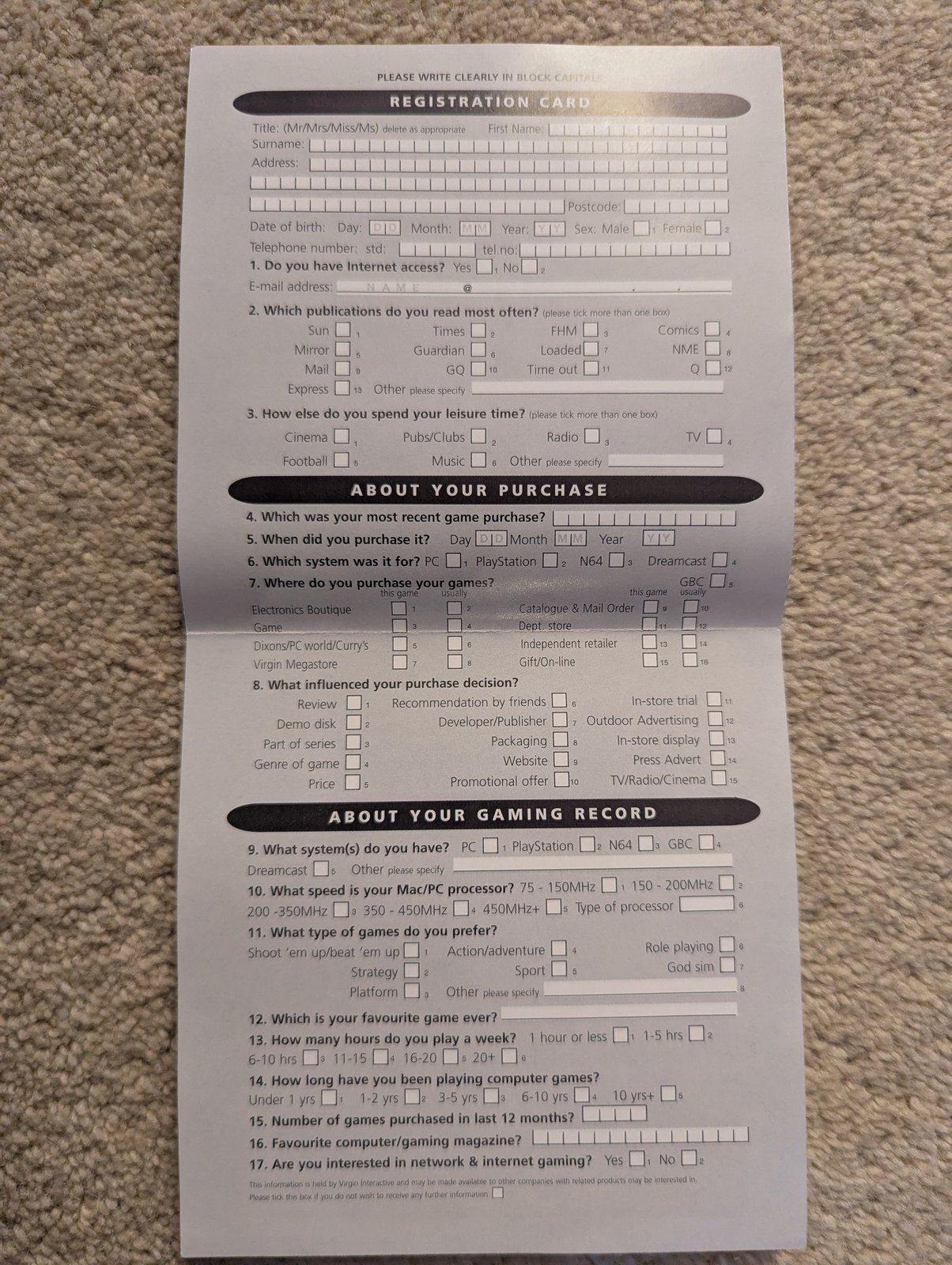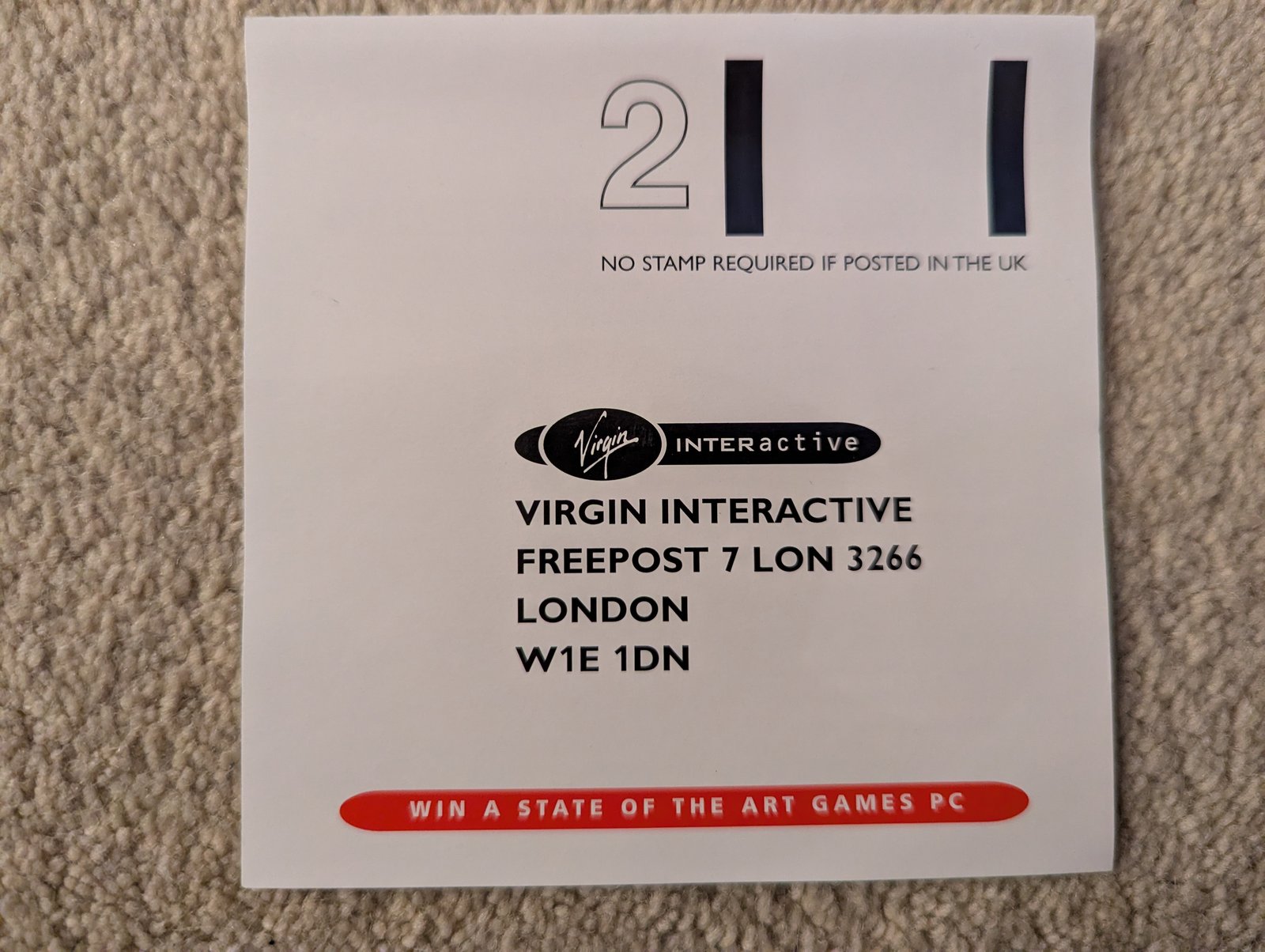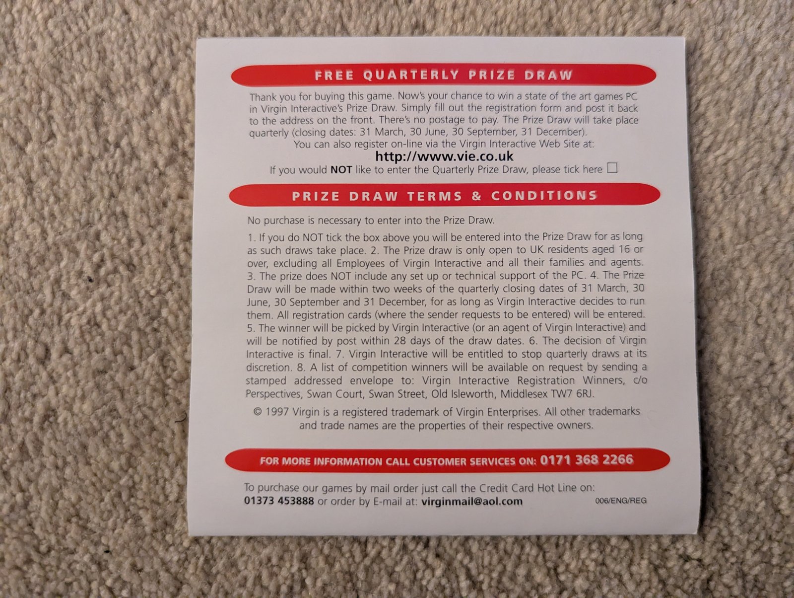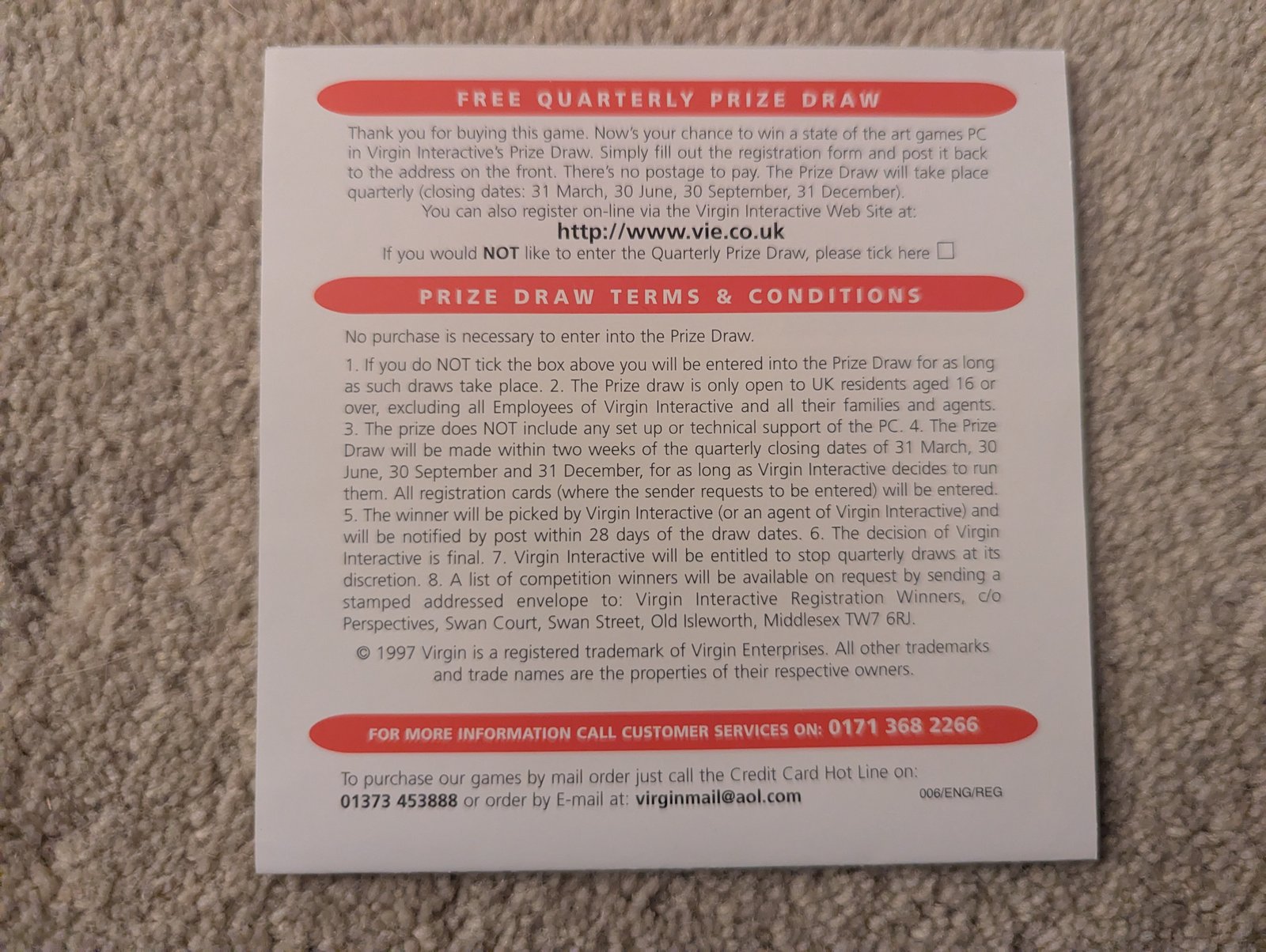 Virgin Interactive 3266 Red Band Registration Card
