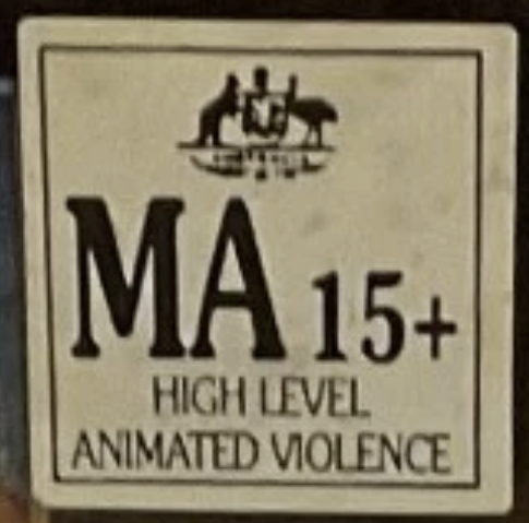 A white square classification sticker displaying the Australian MA15+ age rating, restricted to ages 15 and over.