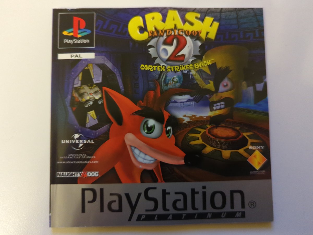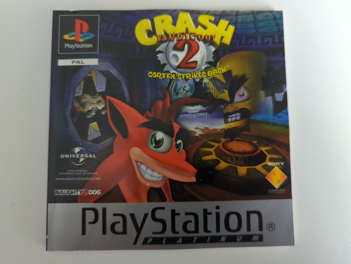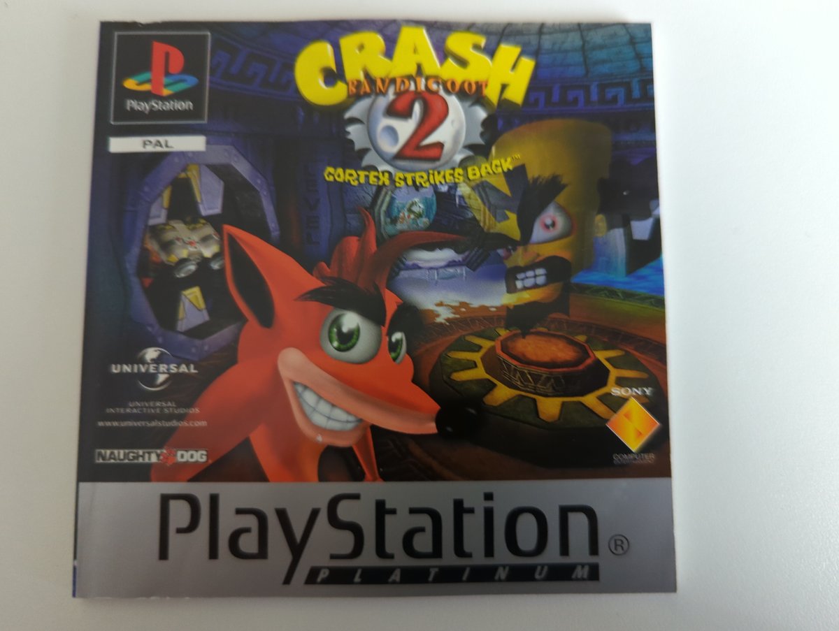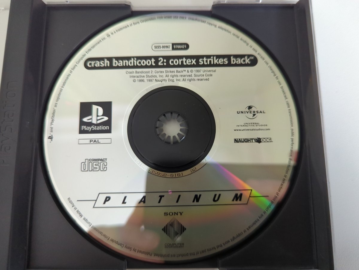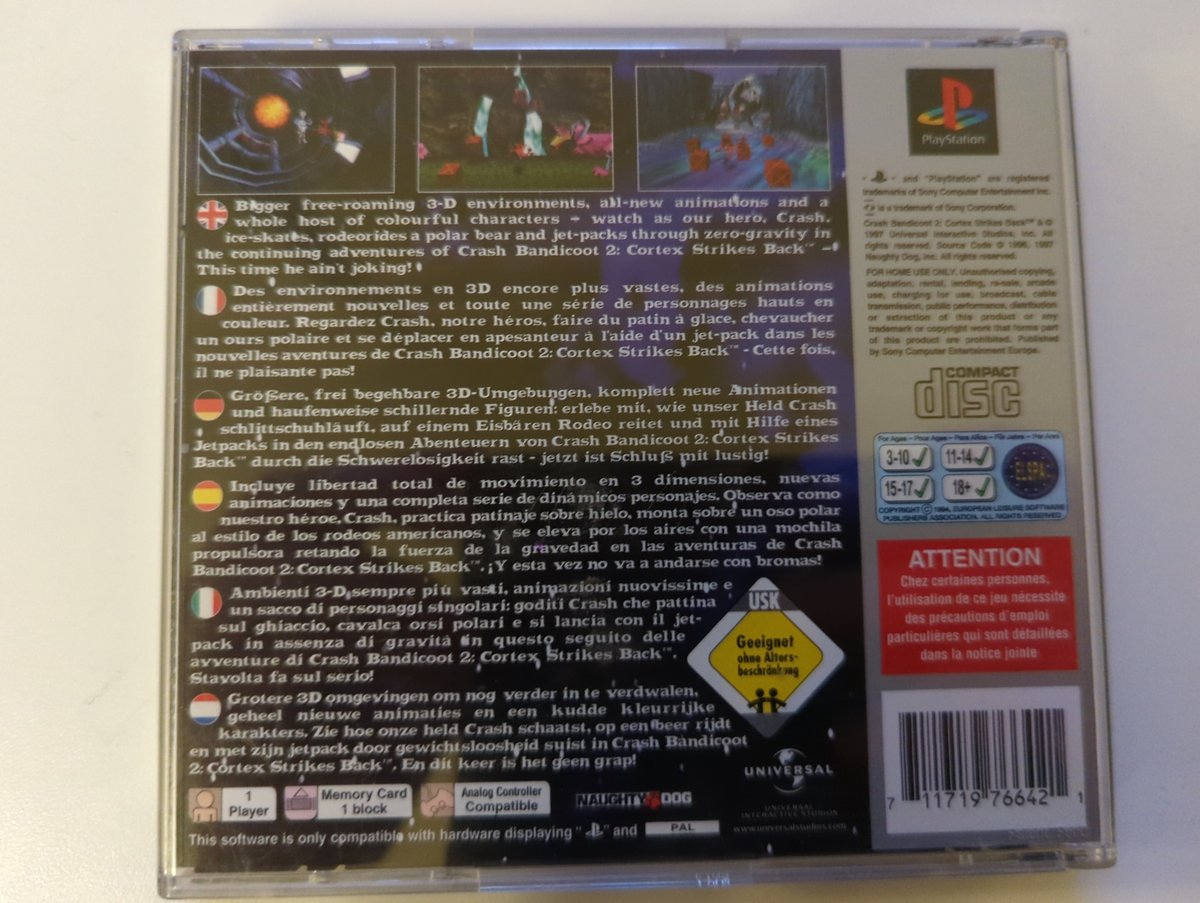 Crash Bandicoot 2: Cortex Strikes Back is a platform game developed by Naughty Dog and published by Sony Computer Entertainment Europe, one of the best-selling PlayStation titles of the era. This Platinum re-release covers the UK, France, Germany, Italy, Spain, and the Netherlands and is one of six catalogued PAL variants for the title. It supports English, French, German, Italian, and Spanish and is housed in a Full Jewel PAL case with a single disc. No release date is recorded for this pressing. The EAN barcode is 0711719766421. The hologram type on the case is unconfirmed.