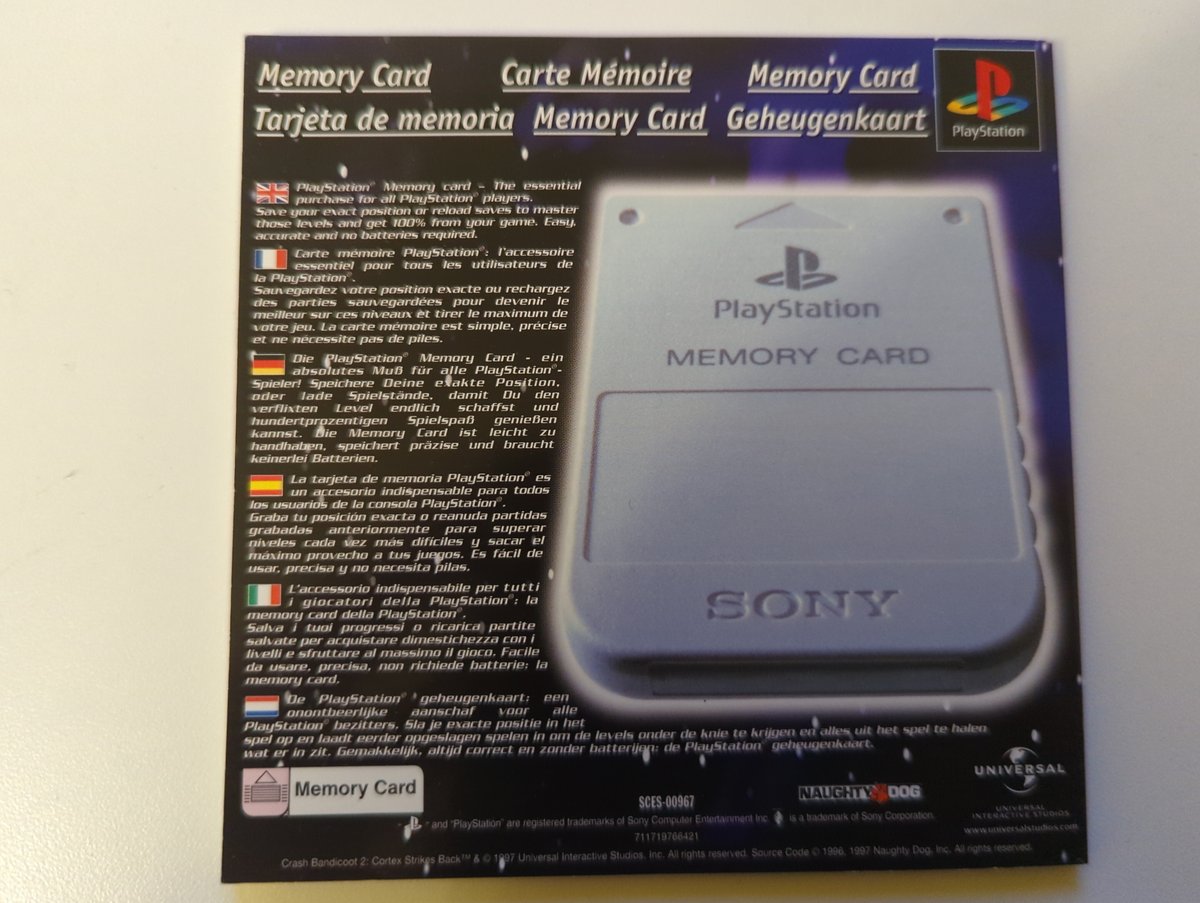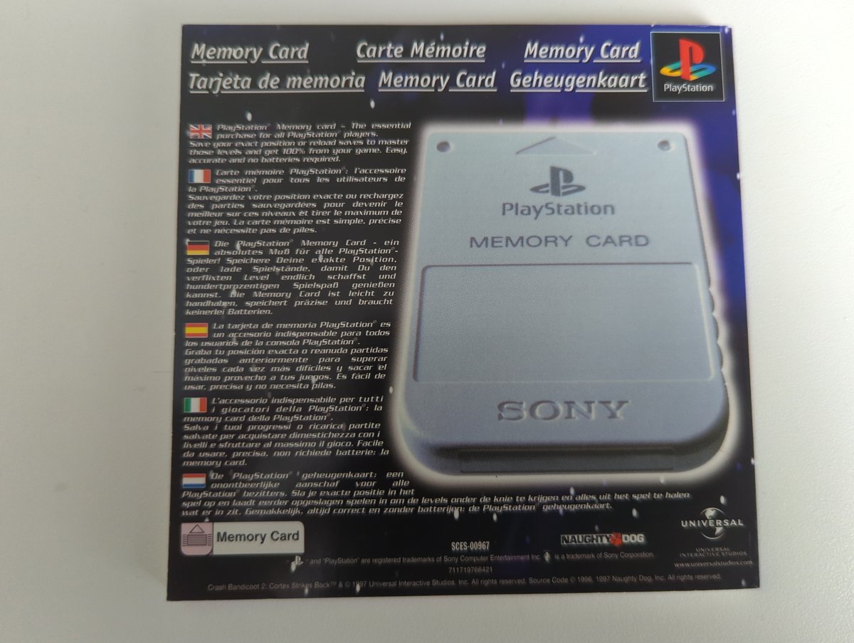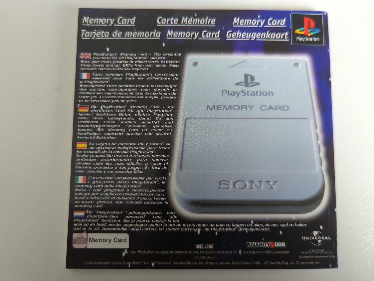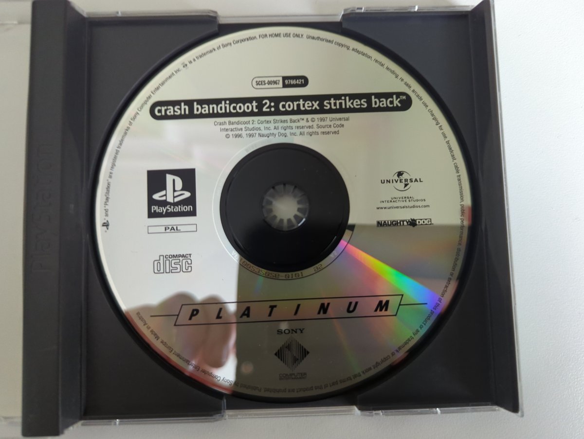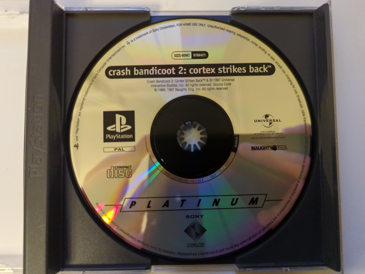 Crash Bandicoot 2: Cortex Strikes Back is a platform game developed by Naughty Dog and published by Sony Computer Entertainment Europe, one of the best-selling PlayStation titles of the era. This Platinum re-release covers the UK, France, Germany, Italy, Spain, and the Netherlands and is one of six catalogued PAL variants for the title. It supports English, French, German, Italian, and Spanish and is housed in a Full Jewel PAL case with a single disc. No release date is recorded for this pressing. The EAN barcode is 0711719766421. The hologram type on the case is unconfirmed.