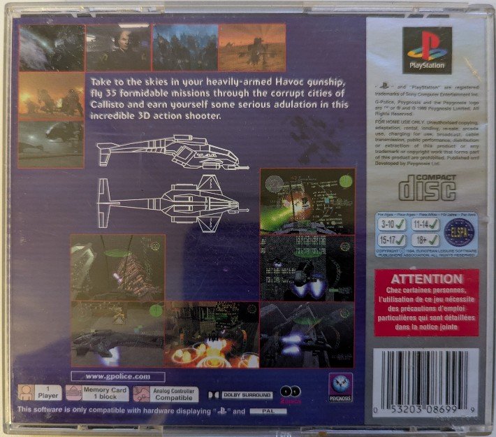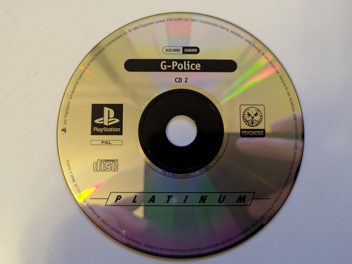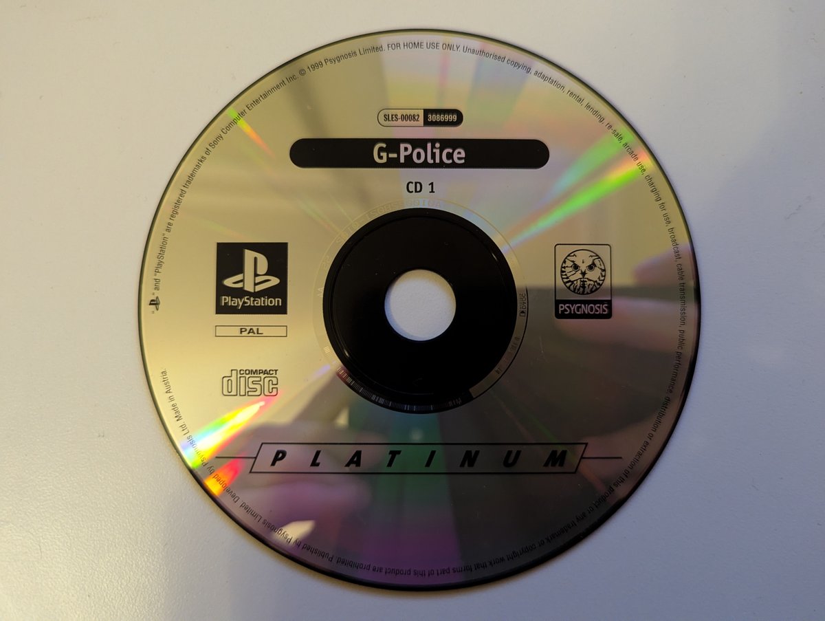 This is the UK Platinum re-release, dated 1 January 1999. It comes in a standard Full Jewel PAL two-disc case carrying a hologram on the case, consistent with the Sony Platinum budget range, and is English-language only. A G-Police Manual Registration Card is included as loose paperwork. No case stickers or bundled demo discs have been documented. The Platinum label identifies this as a later budget re-release issued after the title’s successful original run, and the hologram on the case provides a clear visual marker differentiating it from any hypothetical non-hologram pressings. This is one of two UK variants catalogued for G-Police, the other being the original 1997 release, and forms part of a wider set of ten PAL variants spanning multiple European territories.