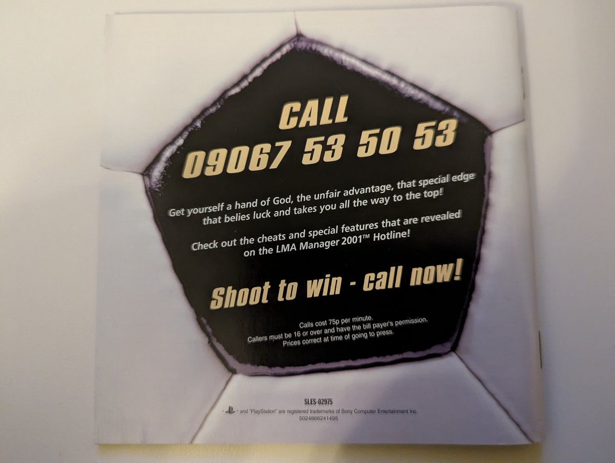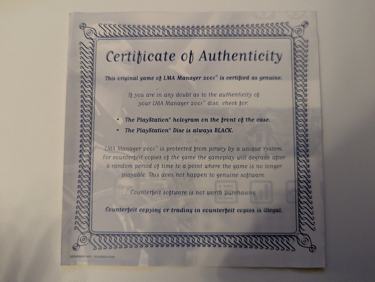 Home / Games / L / LMA Manager 2001 / LMA Manager 2001 LMA Manager 2001 SCES/SLES: SLES-02975 Disk Code: SLES-02975 EAN: 5024866241495 Type: Original Date: 26 January 2001 Publisher: Developer: Case: Full Jewel PAL Hologram: Hologram Languages: English Countries: UK Disc Images Manual Images 📄 Loose Paperwork Manual Registration Card - LMA Manager 2001