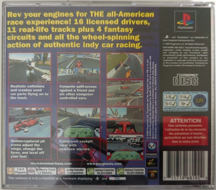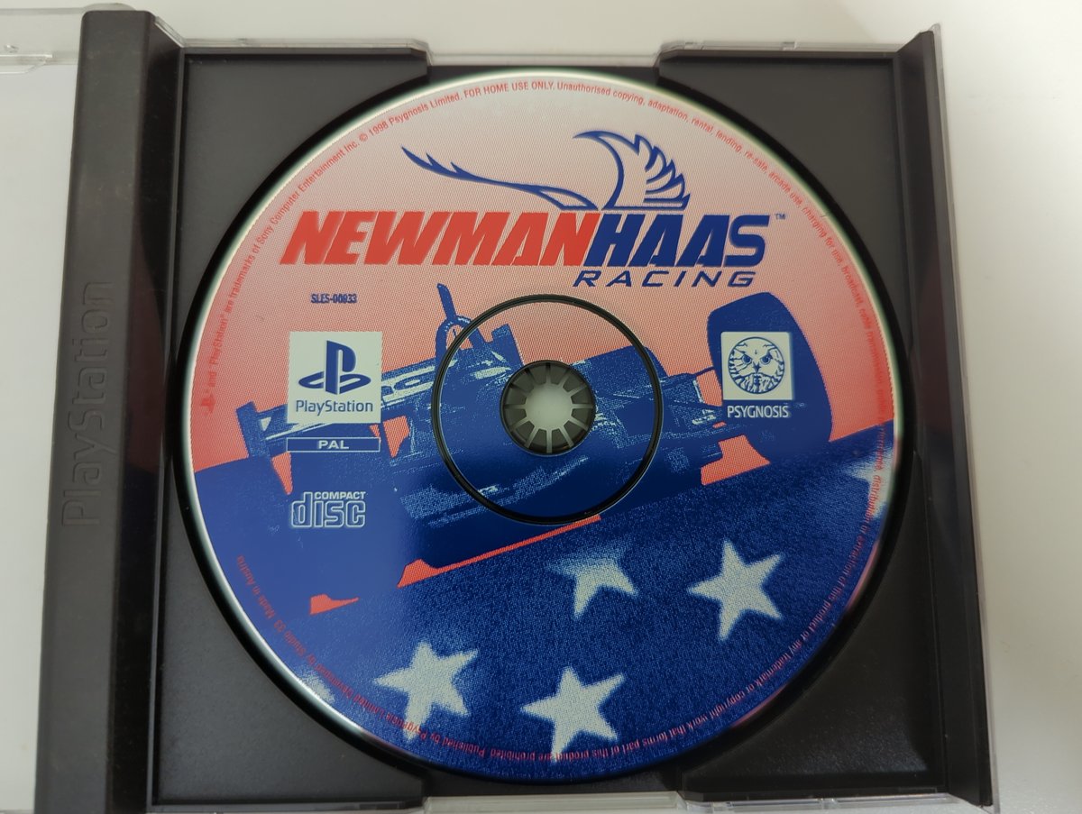 Newman Haas Racing is a racing game developed by Studio 34 and published by Psygnosis, licensed from the Newman/Haas team that won multiple CART championships with drivers including Mario Andretti and Nigel Mansell. This UK original pressing was released on 10 April 1998 and supports English, French, German, and Italian. It is housed in a Full Jewel PAL case with a single disc. The EAN barcode is 0711719681922. The hologram type on the case is unconfirmed. Five PAL variants are catalogued for this title.