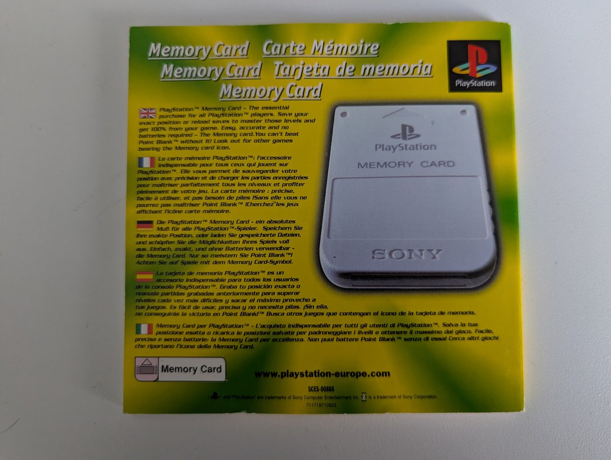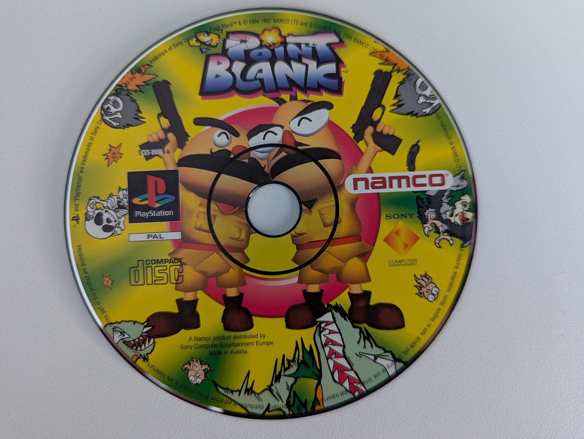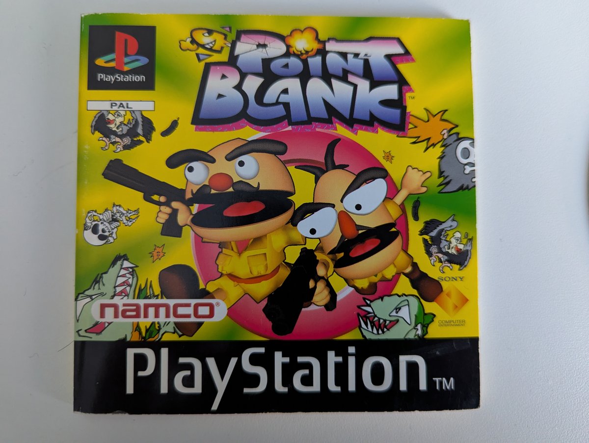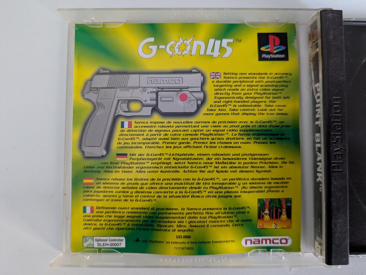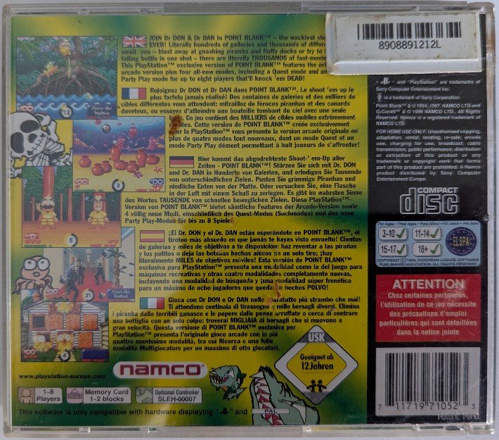 Point Blank is a light gun arcade shooter developed by Tose Software and published by Namco, featuring a variety of target-based challenges demanding speed, accuracy, and quick judgment. This standard retail variant covers the UK, France, Germany, Italy, and Spain and was released on 24 July 1998. It supports English, French, and German and is housed in a Full Jewel PAL case with a single disc. The EAN barcode is 0711719710523. The hologram type on the case is unconfirmed. Two PAL variants are catalogued for this title, the second being a bundle-only pressing.