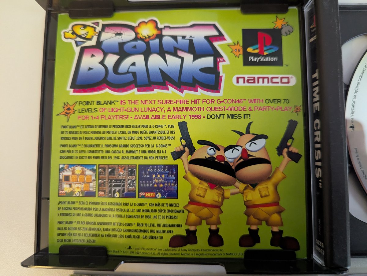 Home / Games / T / Time Crisis / Time Crisis Time Crisis SCES/SLES: SCES-00657 Disk Code: SCES-00657 EAN: 0711719608004 Type: Special Bundle Date: 30 November 1997 Publisher: Developer: Case: Mini Jewel Black Boardered PAL Hologram: Hologram Languages: English, French, German Countries: France, Germany, Italy, Spain, UK Disc Images Manual Images Additional Images