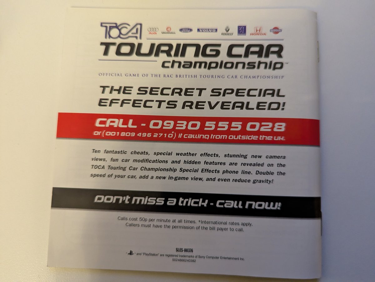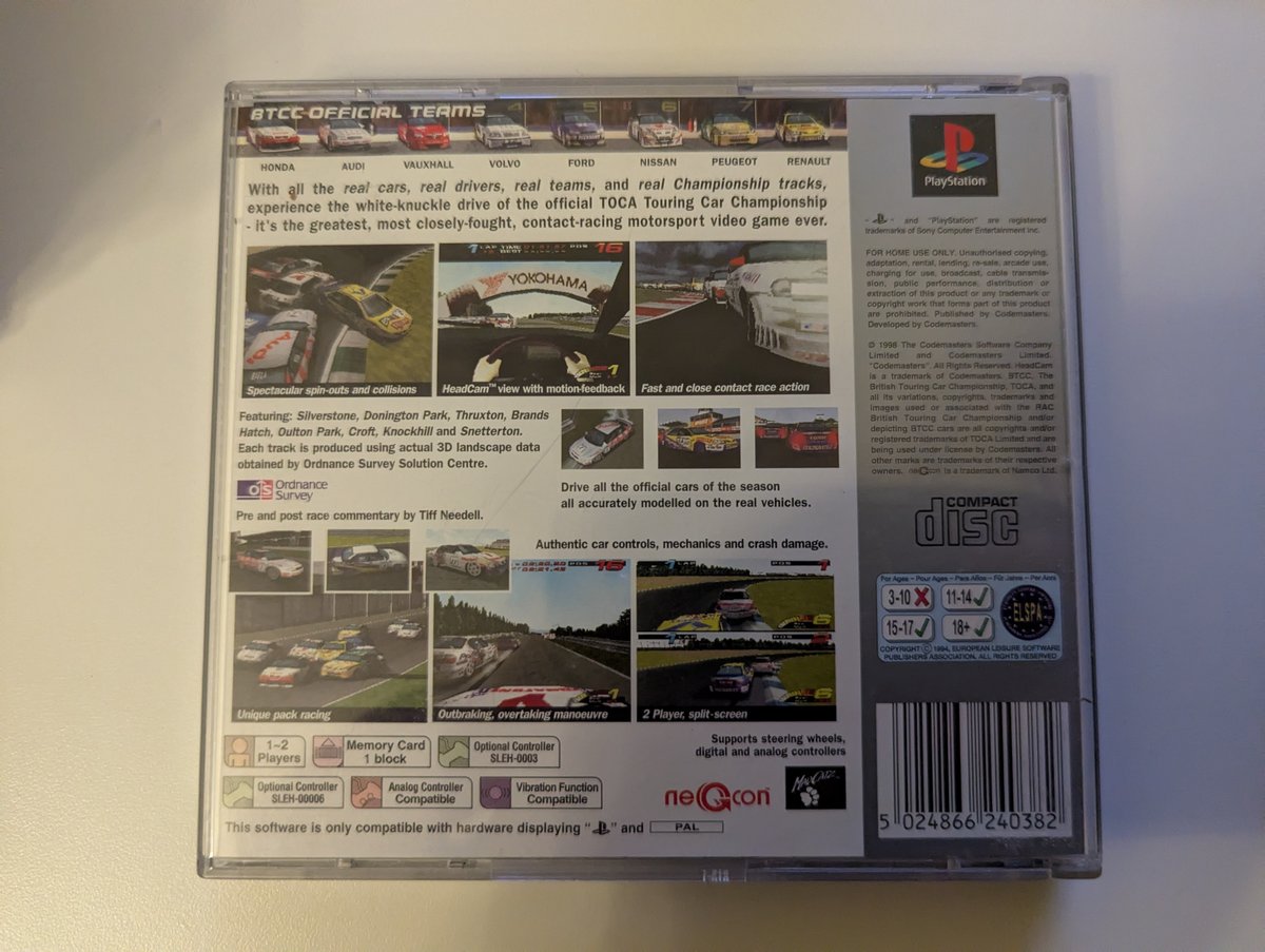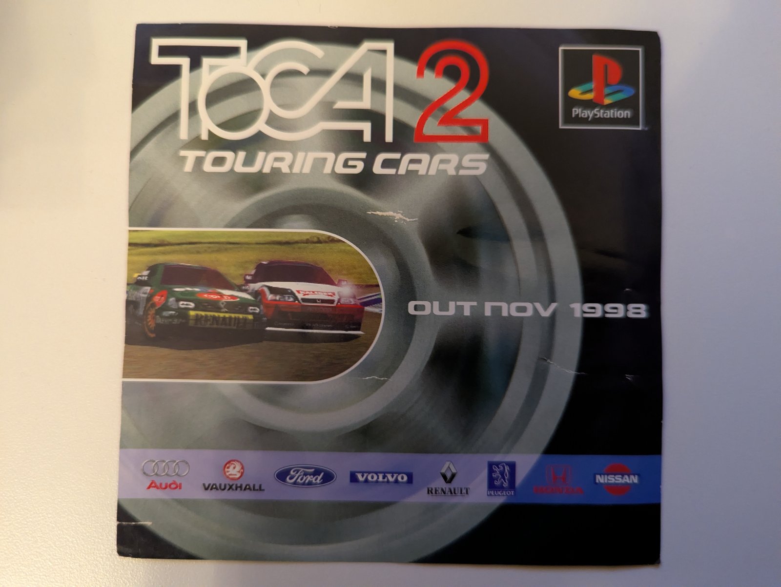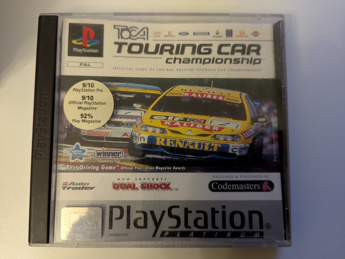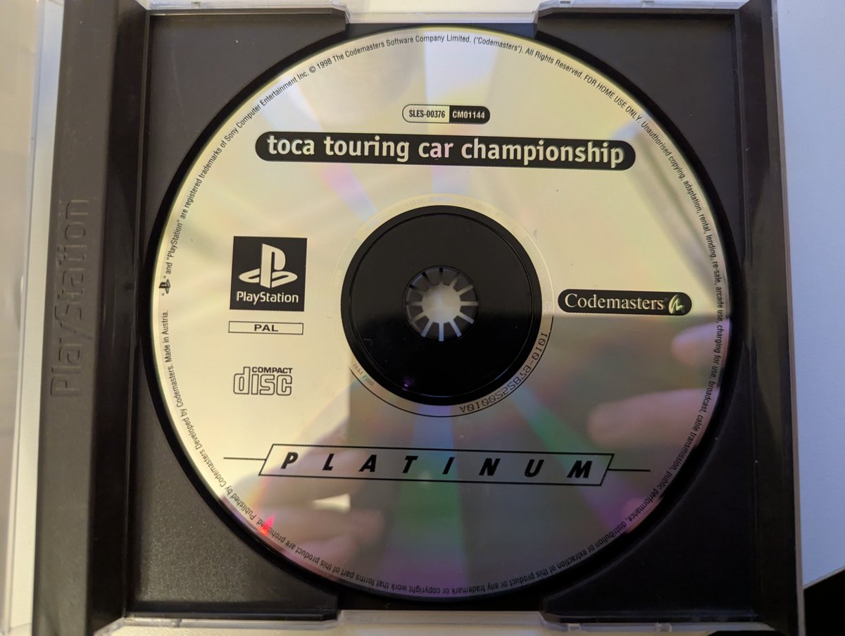 Home / Games / T / TOCA Touring Car Championship / TOCA Touring Car Championship TOCA Touring Car Championship SCES/SLES: SLES-00376 Disk Code: SLES-00376 EAN: 5024866240382 Type: Platinum Date: 1 January 2020 Publisher: Developer: Case: Full Jewel PAL Hologram: Hologram B Languages: English, French, German, Italian, Spanish Countries: UK Disc Images Manual Images 📄 Loose Paperwork TOCA 2 Promo Leaflet 🏷️ Case Stickers Round, Silver, 9/10 PlayStation Pro