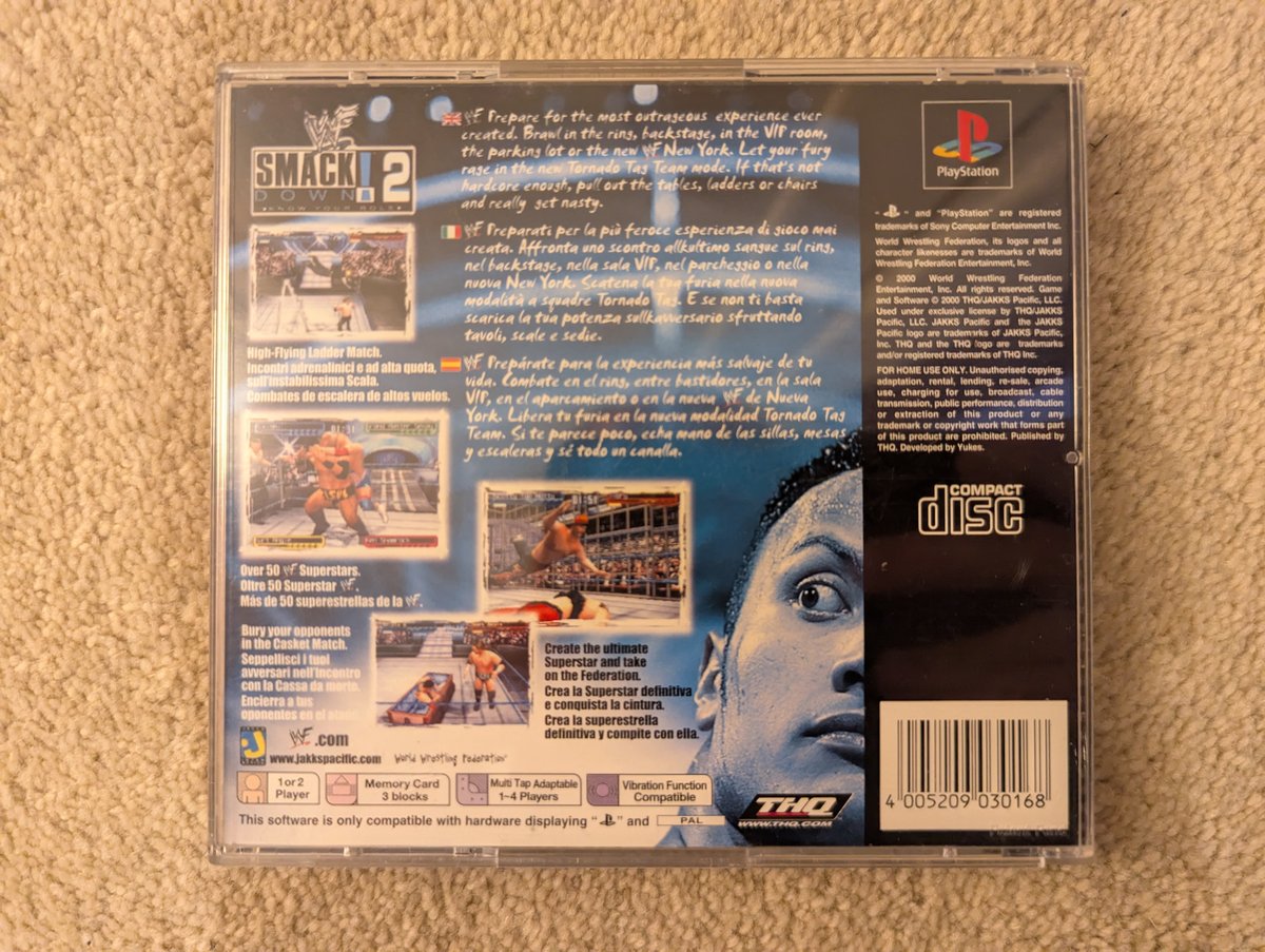 Home / Games / W / WWF SmackDown! 2: Know Your Role / WWF SmackDown! 2: Know Your Role WWF SmackDown! 2: Know Your Role SCES/SLES: SLES-03251 Disk Code: SLES-03251 EAN: 4005209030168 Type: Original Date: 1 January 2001 Publisher: THQ Developer: Yuke's Co Case: Full Jewel PAL Hologram: Hologram B Languages: English Countries: Italy, Spain Disc Images Manual Images